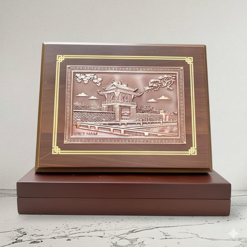 Thiết kế tranh quà tặng này vô cùng thuận tiện và hiện đại. Vật phẩm có thể thay thế hộp quà, vừa có thể dựng thành tranh đặt bàn trưng bày. Hộp gỗ nâu mang lại vẻ sang trọng, hài hòa với màu đồng tự nhiên. Ngoài ra chúng ta có thể thấy được viền tranh được chạm nổi hoa văn cách điệu, bố trí đều về các điểm góc tranh tạo sự hài hoà cả về mặt thẩm mỹ và ý nghĩa. Từng chi tiết mái ngói, trụ cột, ô cửa được thể hiện rất sinh động và mô phỏng gần chính xác so với công trình thực tế.